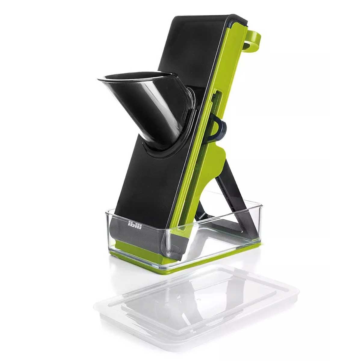 L’utilisation est simple et intuitive. Dépliez le pied pour stabiliser la mandoline, insérez le légume dans le tube d’alimentation, puis utilisez le poussoir. Pressez le piston vers le bas pour trancher. Vos mains restent toujours protégées à l’extérieur du mécanisme de coupe.