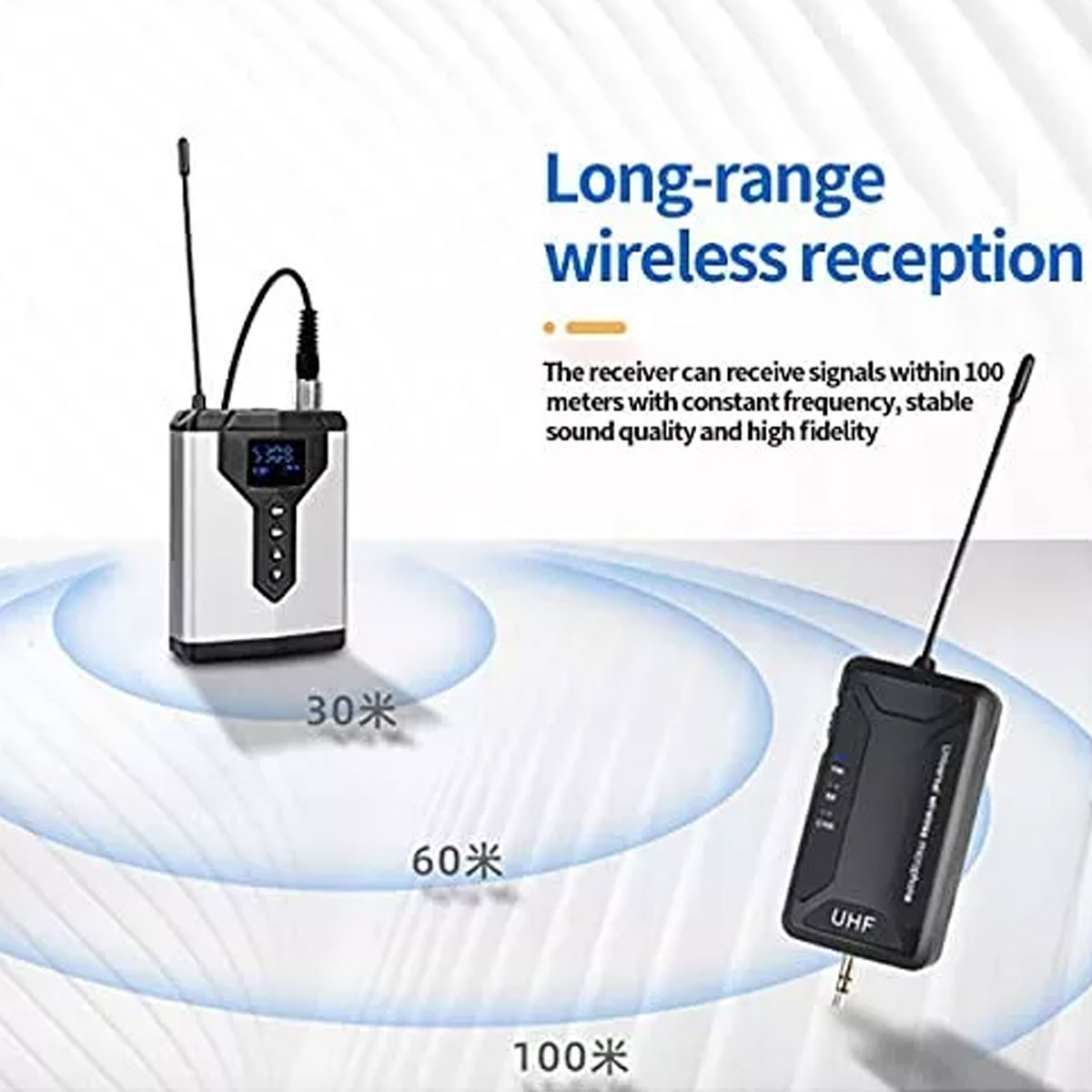 Les 20 fréquences UHF assurent une transmission stable, même à longue distance. Vous bénéficiez d’une portée allant jusqu’à 50 mètres, idéale pour couvrir de grandes salles ou des scènes extérieures.