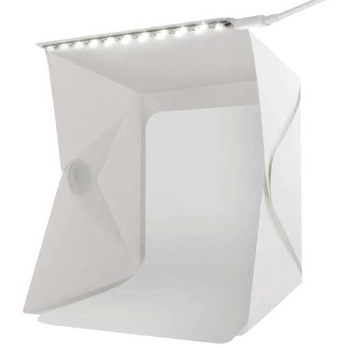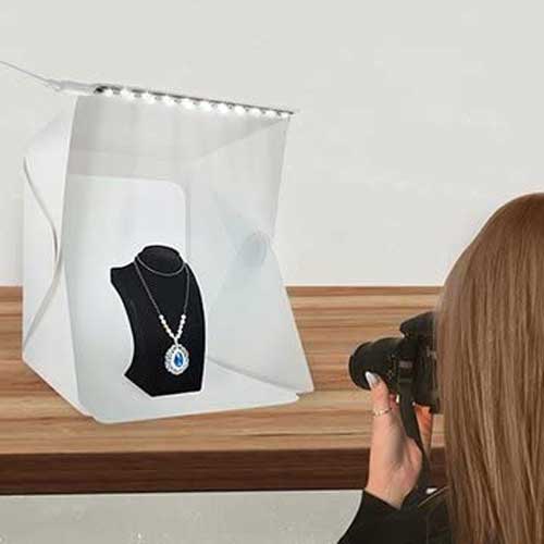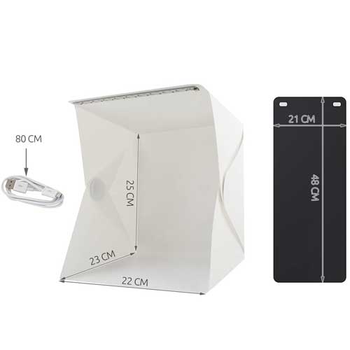 Mini studio photo portable pour bijoux est pliable, compact et vous pouvez donc la transporter ou la ranger facilement. Pour monter le studio photo, il suffit de plier les murs par les bords et de fixer les murs avec des boutons. Le mini-studio photo portable est équipée d’une bande LED, non pas d’un lampe, mais de 20 LEDs intégrés supérieurs avec un éclairage blanc et neutre.