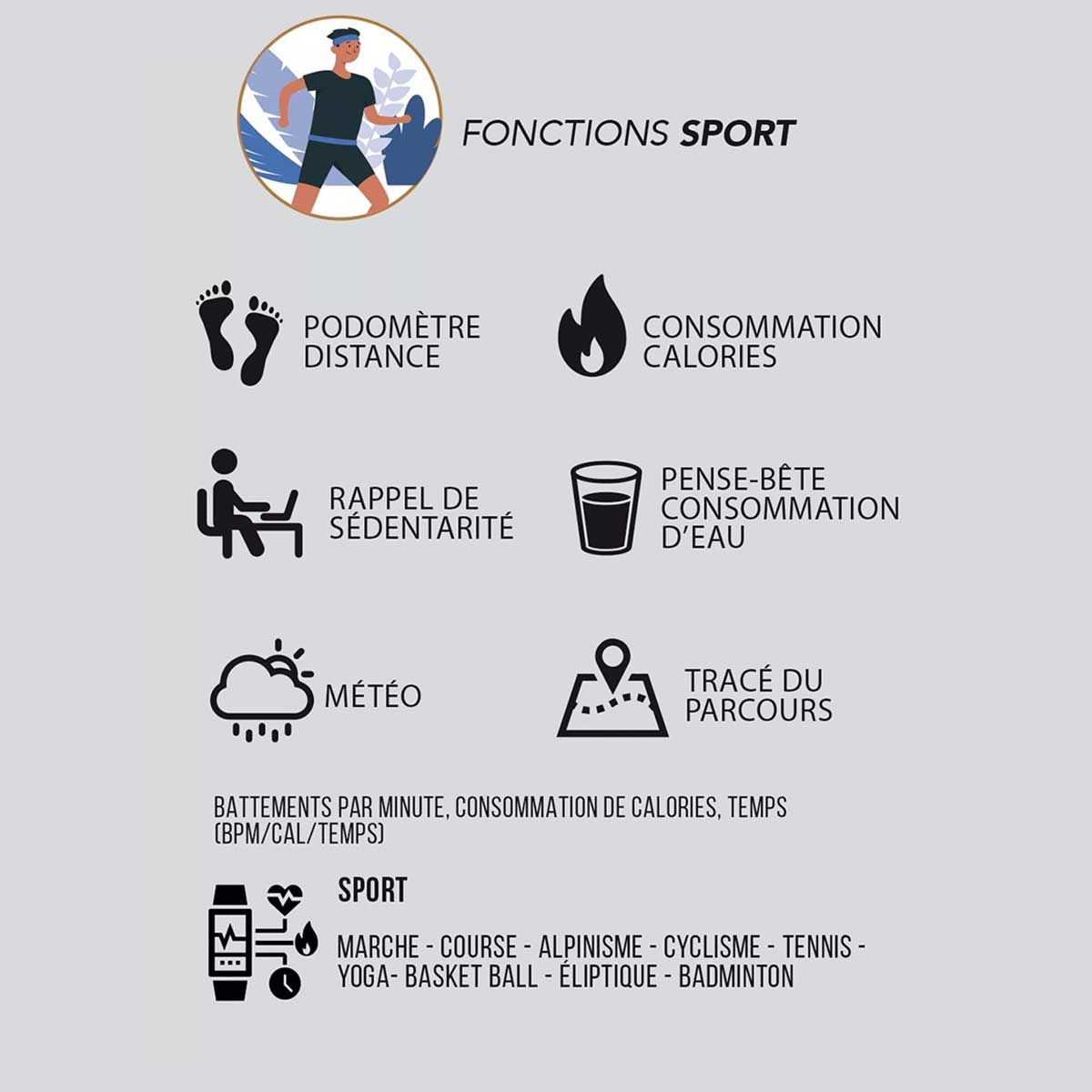 - Mode sportif : Suivi des calories brûlées, podomètre et tracé de parcours