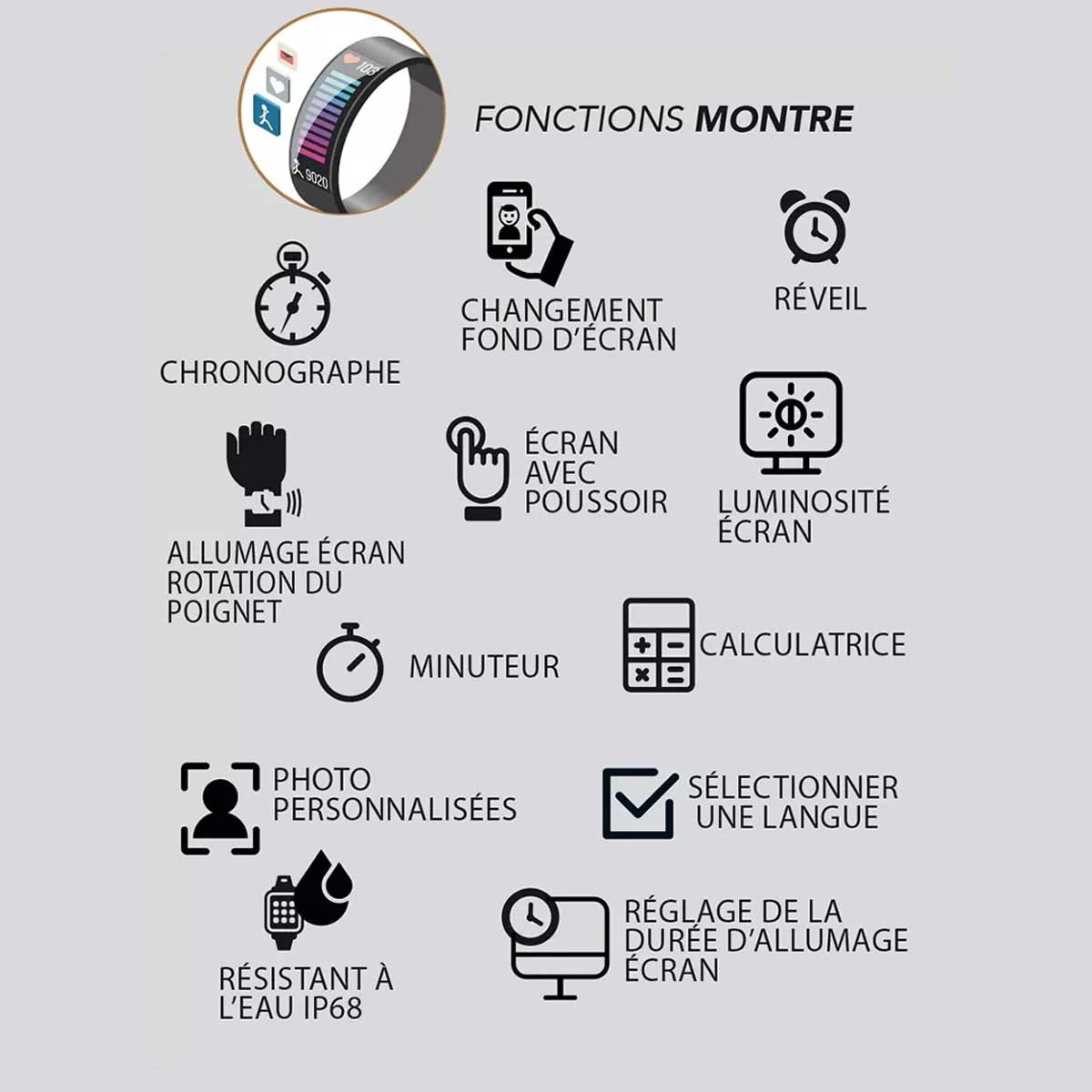 | Étanchéité | Résistance à l’eau (IP68) pour un usage sans souci pendant vos activités sportives ou sous la douche |