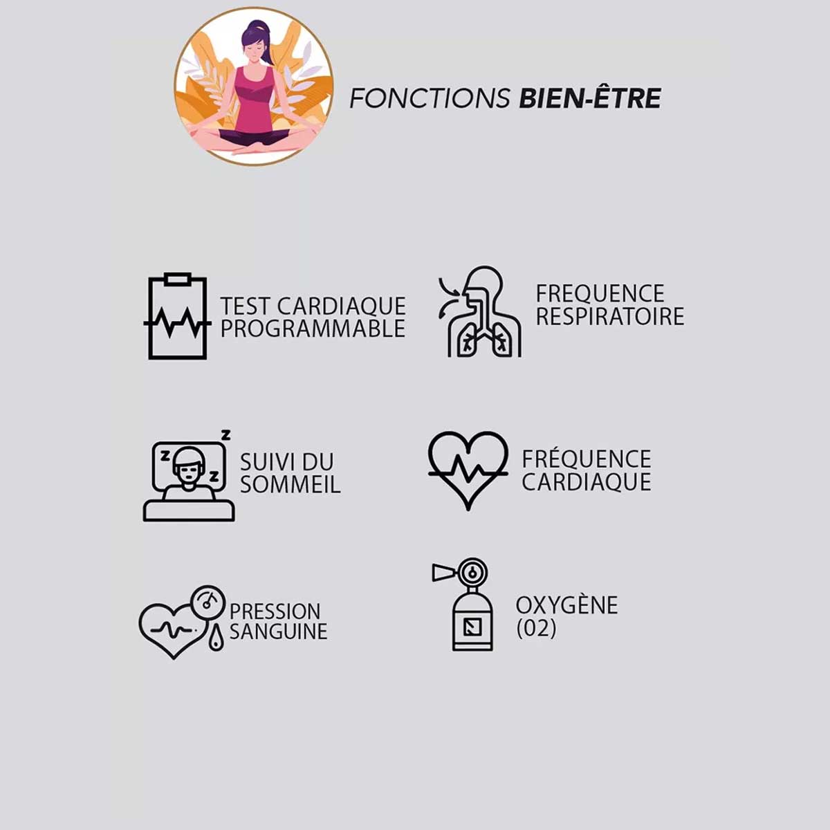 | Suivi de la santé | Mesure de la fréquence cardiaque, pression sanguine et taux d’oxygène (O2) |
