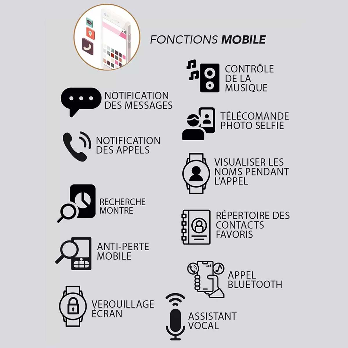 | Contrôle de la musique | Gestion de la musique depuis votre poignet sans sortir votre téléphone |