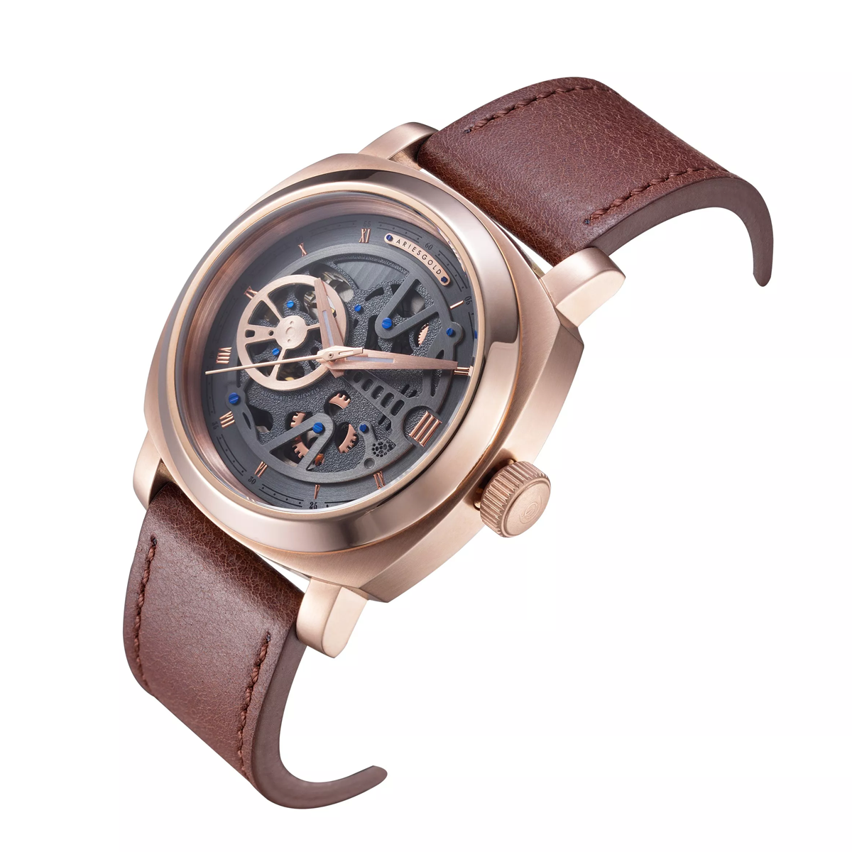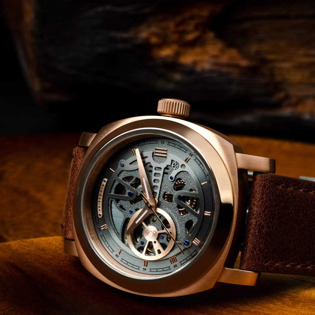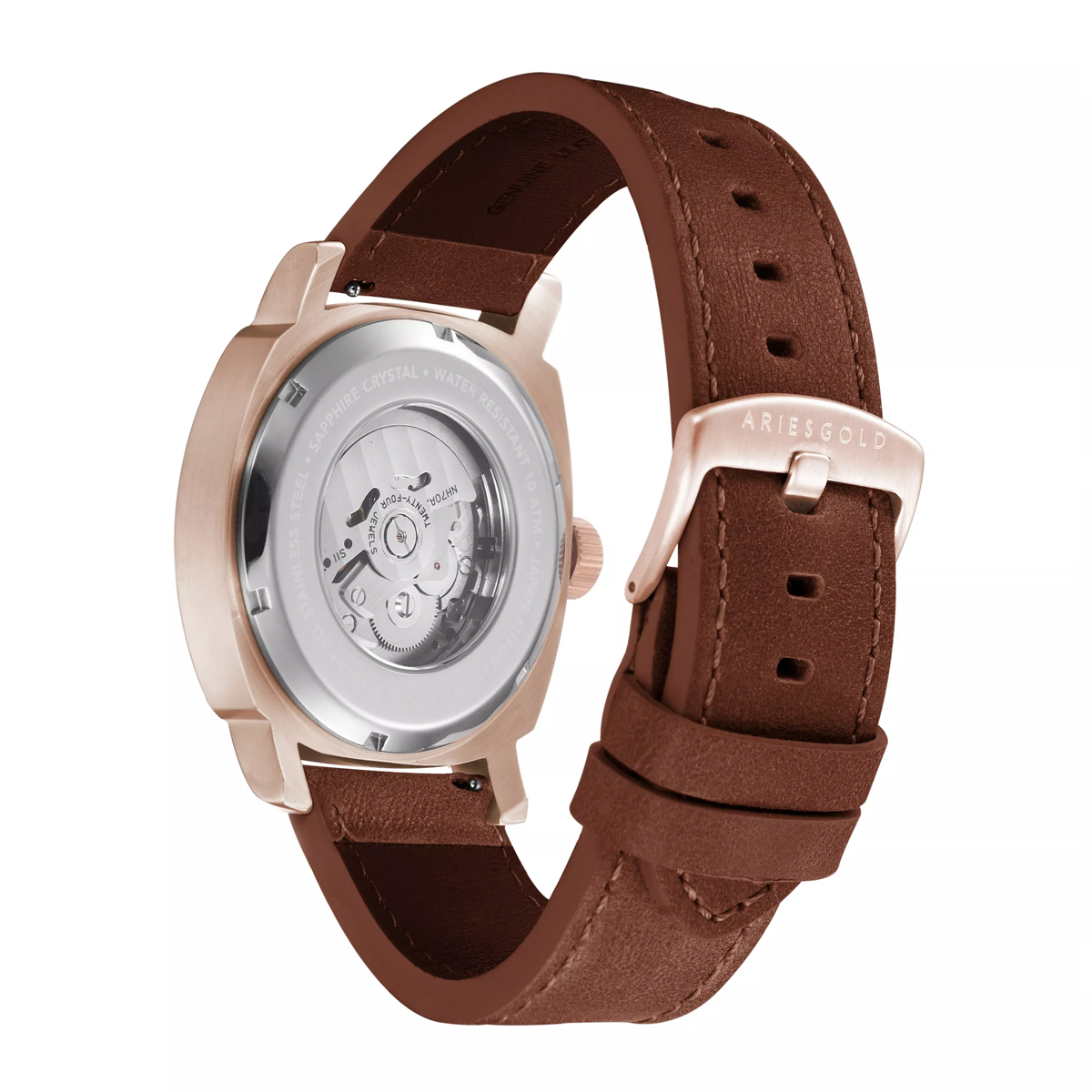 Fond du boîtier en verre saphir vissé d’une seule pièce, pour une meilleure étanchéité et une observation fascinante du mouvement. Couronne personnalisée avec le logo Aries Gold, pour une touche d’exclusivité.
