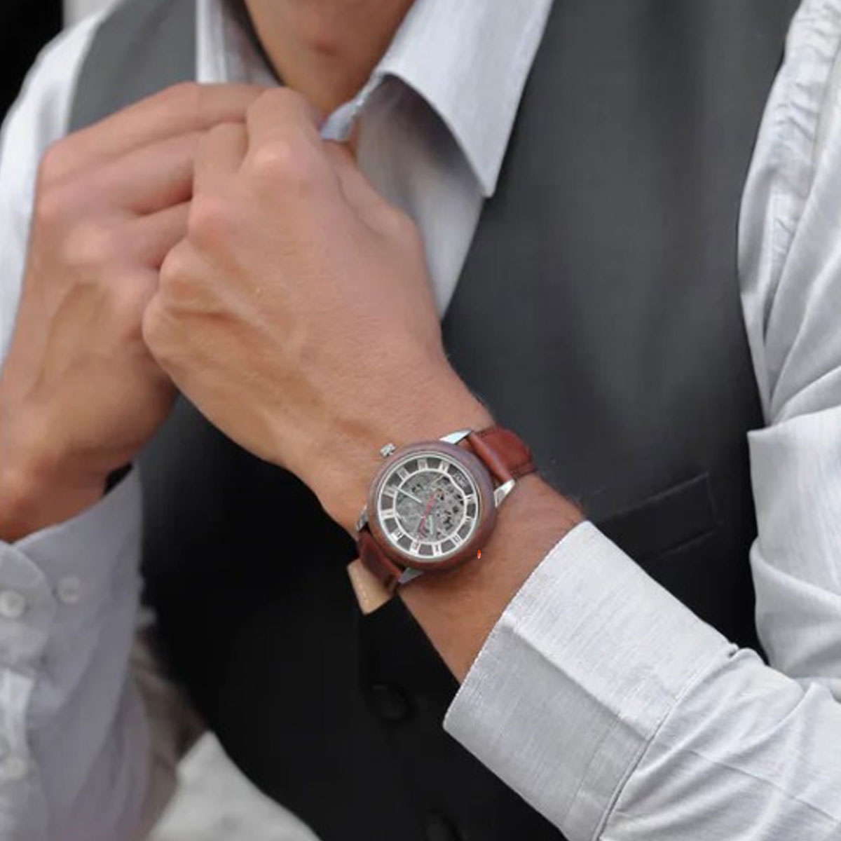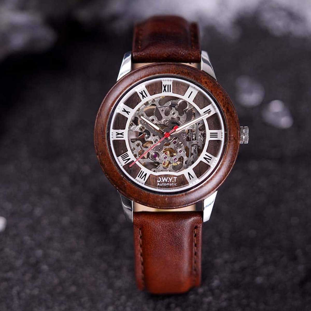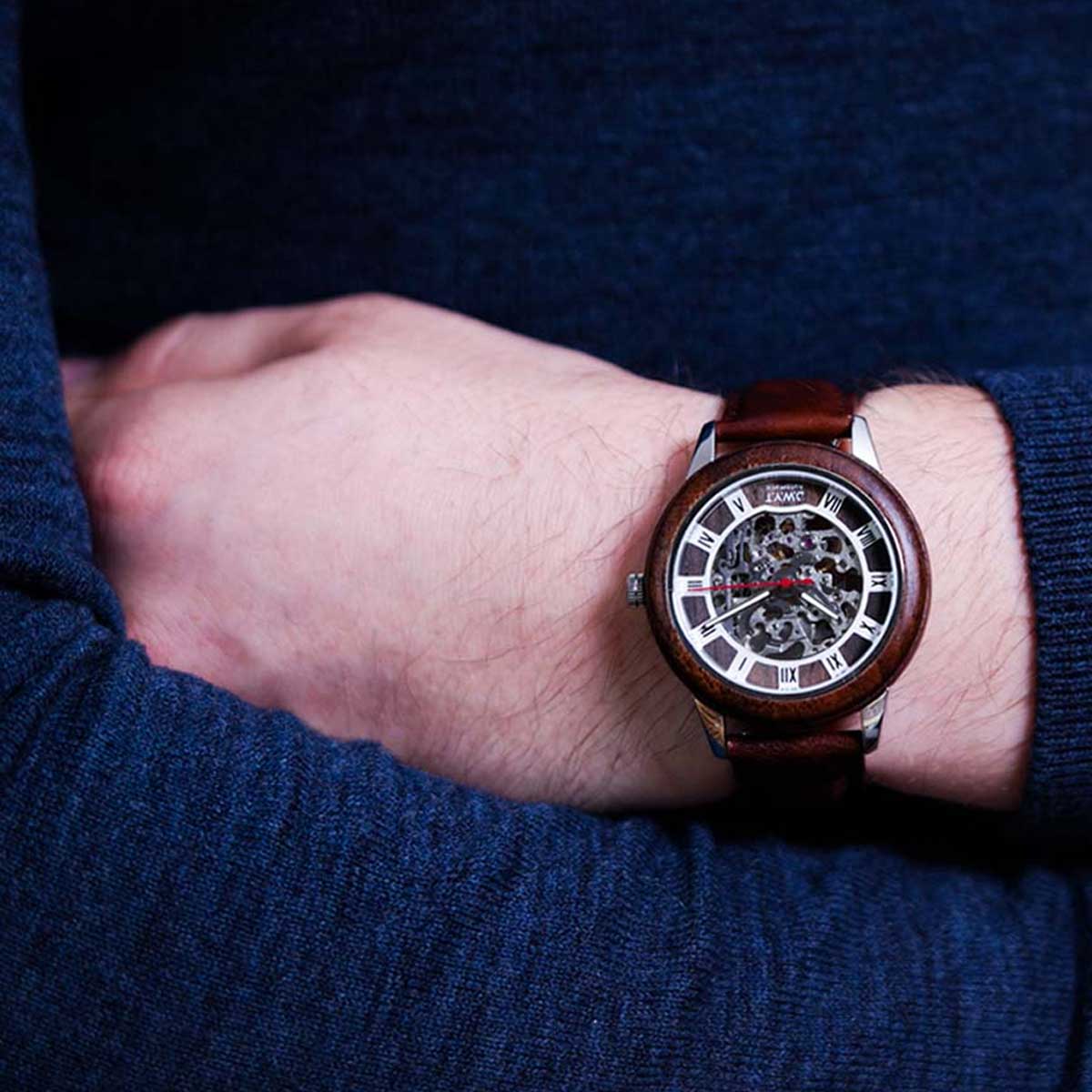 Les montres en bois squelette Impérial, tout comme son inspiration, se distingue par son élégance et son charme uniques. Avec un design squelette sophistiqué, cette montre dévoile le mécanisme automatique à travers un cadran en bois de santal noir, complété par un boîtier en bois de noyer. Plongeons dans l’univers captivant de César et découvrons la singularité de cette pièce horlogère.