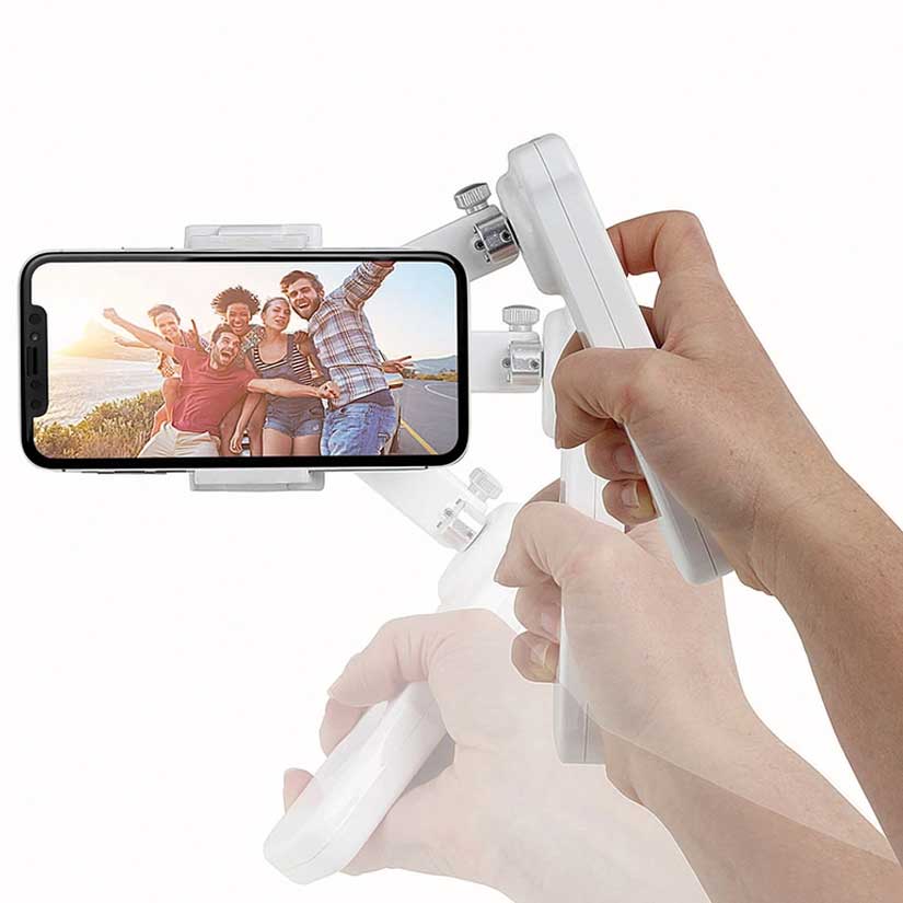 Stabilisateur pour smartphone motorisé, élimine les vibrations et le ballotement. Assure une image limpide et une lecture ultra-fluide, avec système de stabilisation 2 axes, angle ajustable et compatible Bluetooth. Une autonomie jusqu’à 5 heures avec câble de chargement USB inclus