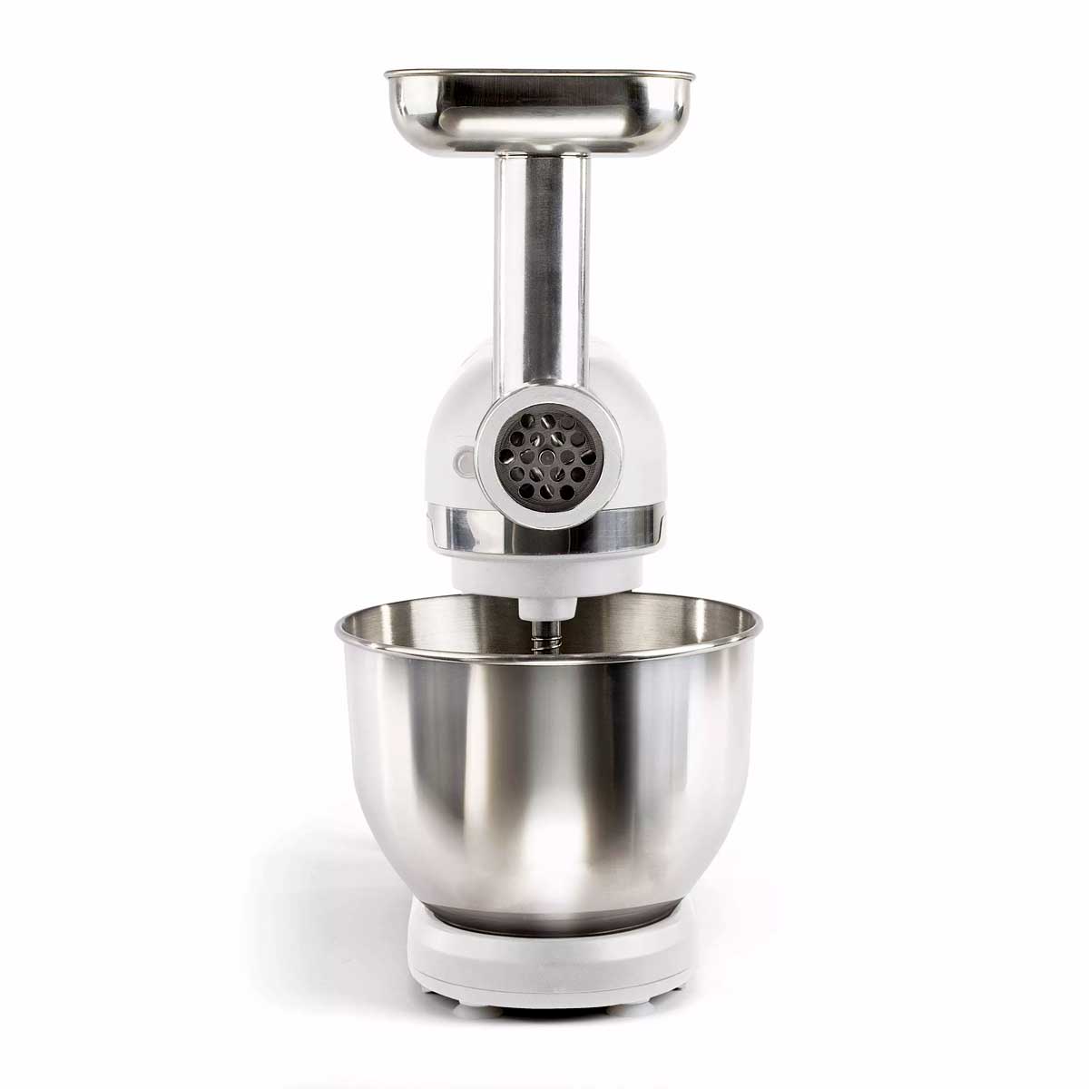 - Accessoires Complets : Livré avec 3 ustensiles essentiels : Un fouet, un crochet pétrisseur et un batteur plat. Ce robot pâtissier est prêt à affronter toutes les recettes. De plus, une gamme d’accessoires supplémentaires est incluse : un mixeur en verre 1,5 L, un hachoir à viande avec couteau 4 lames, des disques hachoir variés, des disques pour pâtes et même un entonnoir à saucisses et un poussoir